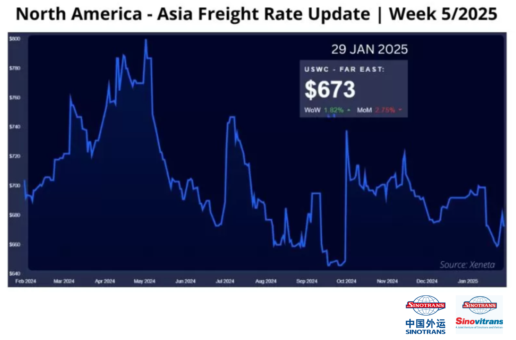 Giá cước vận chuyển từ Bắc Mỹ (Bờ Tây) đến Châu Á tuần 5/2025 tăng 1,82% với tuần trước, lên mức 673 USD/FEU. Mức giá này giảm 2,75% so với tháng trước, theo dữ liệu Xeneta.
