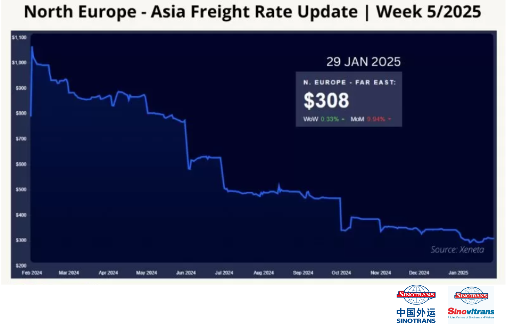Giá cước vận chuyển từ Bắc Âu đến Châu Á tuần 5/2025 tăng 0,33% so với tuần trước, lên mức 308 USD/FEU; mức giá này giảm 9,94% so với tháng trước, theo dữ liệu Xeneta.